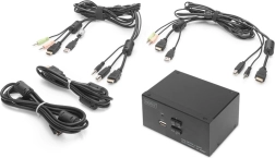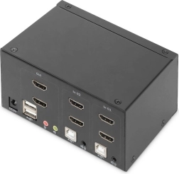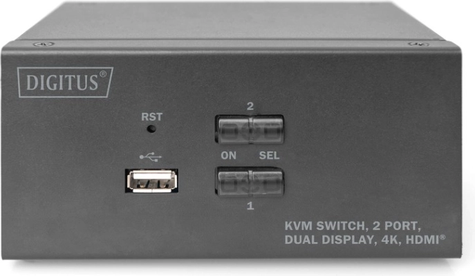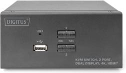 Den kompakte DIGITUS KVM-switch gør det let at administrere to computere med understøttelse af to eksterne skærme via HDMI. Skift mellem PC’erne med én knap eller en tastaturgenvej uden konstant at flytte kabler. Switchen håndterer også lyd (mikrofon/hovedtelefoner) og tilbyder en frontmonteret USB-port til hurtig tilslutning af flashdrev eller andet tilbehør.