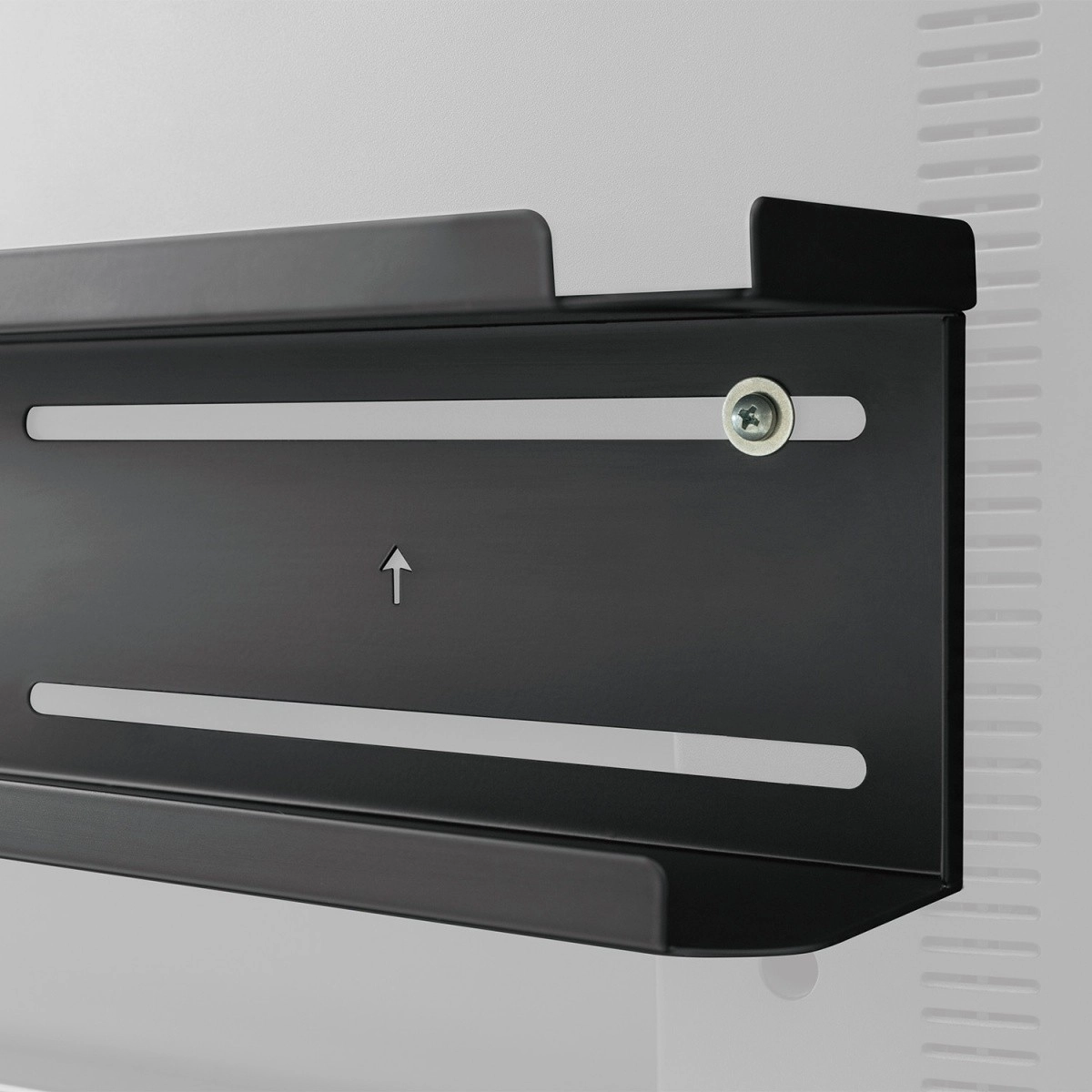2-i-1 hylde med to monteringsmuligheder: på væggen eller på bagsiden af tv’et. Hylden består af to niveauer – den øverste hylde har desuden en skridsikker måtte, som giver ekstra beskyttelse mod, at genstande falder ned. Det universelle design passer nemt ind i ethvert miljø. Med denne opbevaringshylde kan området omkring tv’et organiseres lettere. Den store overflade giver rigelig plads til blandt andet router, tv-fjernbetjening, strømskinne og andre ting. Den maksimale belastning for hylden er 2 kg.