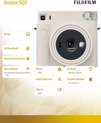 Fujifilm Instax SQ1 er designet til dem, der vil fange spontane øjeblikke med enkel betjening og kompakt design. Den er udstyret med et objektiv med brændvidde på 65,75 mm og lysstyrke f/12,6, hvilket muliggør fotografering fra en afstand på 30 cm. Den særlige selfietilstand med integreret spejl gør det nemmere at tage selvportrætter. Kameraet bruger Instax SQUARE-film og drives af to CR2-batterier, som rækker til cirka 30 pakker film med 10 billeder i hver.