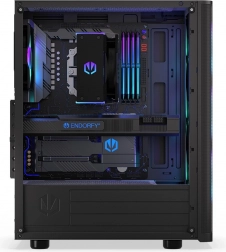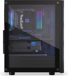 ENDORFY Ventum 200 ARGB er et rummeligt gaming-pc-kabinet med sidepanel i hærdet glas, der kombinerer fremragende airflow, 4 forinstallerede Stratus 120 PWM ARGB-blæsere og finperforeret frontpanel med støvfiltre. Understøtter ATX, op til 7 blæsere og vandkøling med 360 mm radiator foran og 240 mm i toppen – et ideelt fundament for en kraftig, stille og stilfuldt oplyst build.