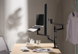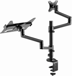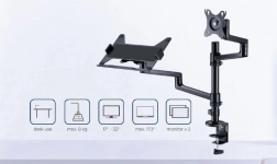 Én arm til monitor 17–32'' (VESA 75×75/100×100), den anden med hylde til bærbar op til 17,3''. Du sparer plads og opnår en perfekt koordineret arbejdsplads.