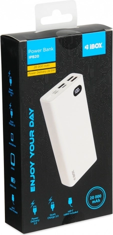 Den kraftfulde IBOX‑powerbank med kapacitet på 20.000 mAh holder dine enheder kørende hele dagen. Den understøtter hurtigopladning Power Delivery og Quick Charge, tilbyder USB‑C og USB‑A porte, et overskueligt LCD‑display, og i pakken finder du et USB‑C‑kabel.