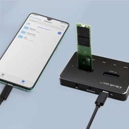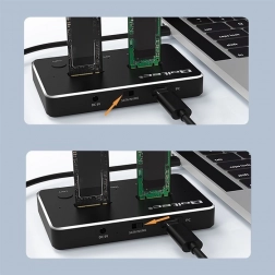 Hurtig overførsel og to metoder til datakopiering. Installation af SSD er enkel og hurtig. Sæt blot drevet i dockingstationen, tilslut til enheden og begynd at bruge den. Stationen tilbyder to kopieringsmetoder: via USB-C til en computer eller offline kopiering.