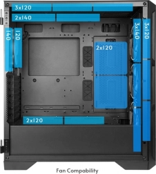 Fire forinstallerede 120 mm ARGB-blæsere leverer stærk luftstrøm og støjsvag drift. Belysningen kan synkroniseres med bundkortet.