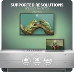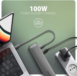 Takket være det hurtige interface USB 3.2 Gen 1 (5 Gb/s) håndteres uden problemer to eksterne drev samtidig, opladning af telefon eller tablet op til 1,5 A/5 V, og der er support for HDR, høje opdateringsfrekvenser (op til 2K/144 Hz, Full HD/240 Hz) samt HDCP 1.4–2.3. Den aluminiumsbaserede konstruktion sikrer robusthed og passiv køling; medfølgende pads gør det muligt at bruge hubben som stand for bedre køling af den bærbare.
