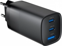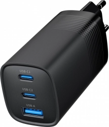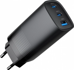 Opladeren med tre porte leverer en høj effekt på 65 W, hvilket er tilstrækkeligt til hurtig opladning af både smartphones og bærbare computere. Den bruger GaN-teknologi, som gør det muligt at skabe en kompakt og bærbar enhed, der samtidig er energieffektiv.