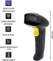 Med Plug&Play-tilslutning fungerer den straks via USB uden softwareinstallation. Hastighed op til 200 scans/sek., nem læsning i forskellige vinkler og stødresistens ved fald op til 1,5 m gør denne læser til en pålidelig hjælper til lageroptælling, varemodtagelse og kassearbejde.
