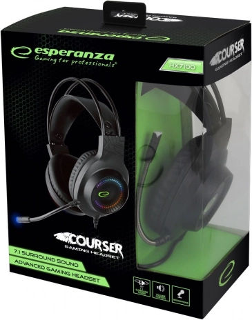Gaming-headsettet med mikrofon 7.1 COURSER tilbyder 7.1 surroundlyd, klar kommunikation og behagelig pasform takket være blød polstring og store ørepuder i kunstlæder, som effektivt dæmper omgivende støj.