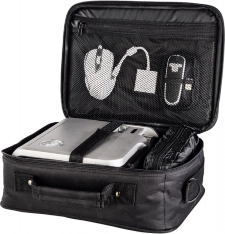 Det gennemtænkte indre med en justerbar og aftagelig skillevæg gør det let at tilpasse pladsen til projektor og tilbehør. En separat dokumentlomme, en indvendig netlomme med skjult lynlås samt en forreste udvendig lomme sikrer overskuelig opbevaring af alle nødvendigheder – fra kabler til fjernbetjening.