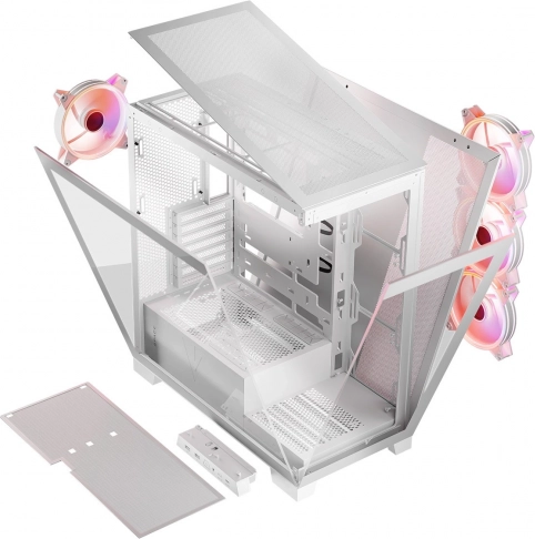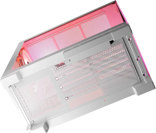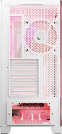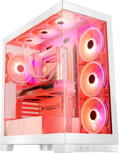 Volcano Space er et hvidt mid‑tower kabinet, der imponerer med et overskueligt interiør og to paneler i hærdet glas. Konstruktionen muliggør montering af både klassiske ATX-bundkort og moderne modeller med omvendte stik (fx MSI Project Zero, ASUS B760M‑BTF). Dermed skjuler du nemt kabelføringen og kan fremvise dine gamingkomponenter fuldt ud.