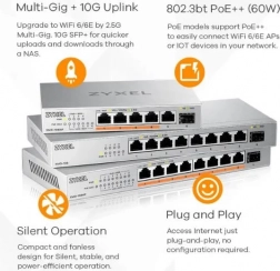 Zyxel XMG-108 er et ideelt valg for gamere, indholdsskabere og små kontorer. Den leverer fuld 2,5G kapacitet på alle otte kobberporte samt 10G SFP+ til tilslutning af NAS, server eller uplink til en hurtig backbone. Implementeringen er øjeblikkelig – du tilslutter blot og kører.