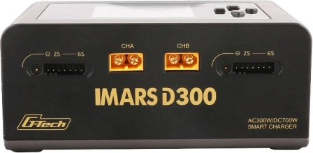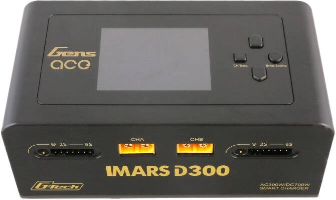 Gens Ace IMARS D300 G‑Tech er en intelligent AC/DC‑oplader designet til både G‑Tech Eco‑batterier og almindelige batteripakker. Den genkender automatisk typen af G‑Tech‑batteri, spænding og anbefalet opladestrøm, så opladningen er hurtig, præcis og sikker. To uafhængige kanaler gør det muligt at oplade to batterier samtidig med op til AC 300 W eller DC 2×350 W.