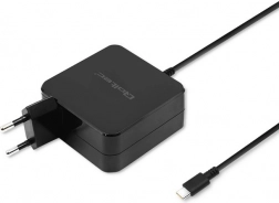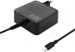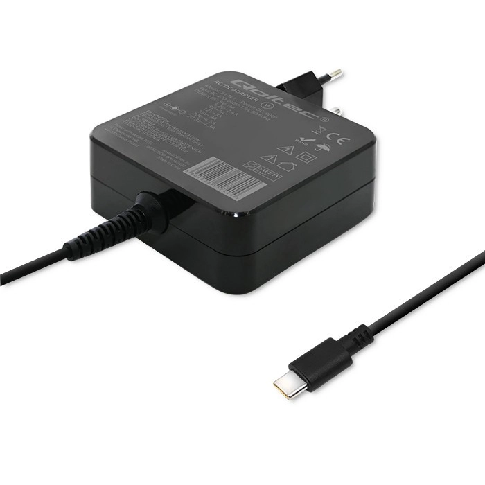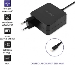Vægoplader fra Qoltec med en effekt på 90 W. Den har et indbygget kabel med USB-C-stik.