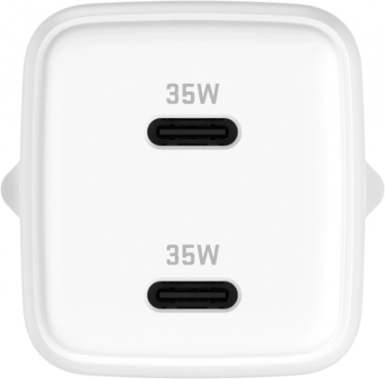 - To udgangsporte muliggør samtidig strømforsyning af to enheder. En enkelt port når op til 35W, ved samtidig brug 17W for C1 og 18W for C2.