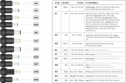 Indeholder tips M4 til M19 med detaljerede specifikationer som spænding og kompatible bærbare modeller.