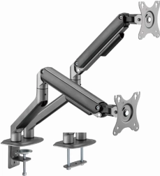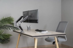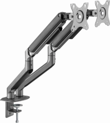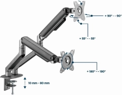Øg komfort og produktivitet med dette bordbeslag til 2 skærme for skærmstørrelser 17–32". Det tilbyder jævn positionering takket være gasfjedre, rotation, tilt og pivot til portræt, solid montering med klemme eller gennemføring samt kabelstyring for en ryddelig arbejdsplads. Maks. belastning pr. skærm op til 9 kg, kompatibel med VESA 75 × 75 og 100 × 100.