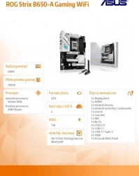 Bundkortet ROG STRIX B650-A Gaming WiFi leverer høj ydeevne, førsteklasses termisk robusthed og moderne udstyr til builds med AMD Ryzen 7000-processorer. Det byder på PCIe 5.0 M.2, hurtige DDR5-moduler og Wi‑Fi 6E for lynhurtig tilslutning – alt sammen i et attraktivt sort‑sølv STRIX‑design.