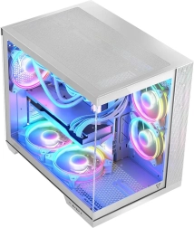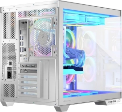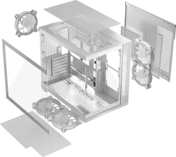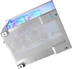 Modellen Volcano Panorama følger de nyeste trends for fremvisning af installerede komponenter. Ét panel i hærdet glas er ikke nok – her har vi gjort det muligt at vise hele computeren fuldt ud. Dyre grafikkort, RAM-moduler, CPU‑køling – det ville være en skam at gemme dem væk. Hvis du bygger en pc med nøje udvalgte komponenter, ved vi, hvor vigtigt det er for dig at kunne vise dem frem. Vi har forberedt flere versioner af modellen, bl.a. med op til syv forinstallerede blæsere, fem eller tre, hvilket giver dig brede konfigurationsmuligheder. Og ved at vælge Volcano Panorama får du frem for alt mulighed for montering af bundkort med omvendte stik, masser af plads til komponenter – lange grafikkort og høj CPU‑køler – en USB‑C‑port og to USB 3.0‑porte samt tokammer‑design, hvor den vertikalt monterede strømforsyning er adskilt fra installationsdelen. Det hele er lukket inde bag to glaspaneler for bedst mulig effekt.