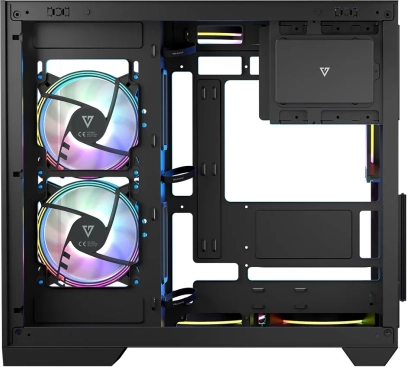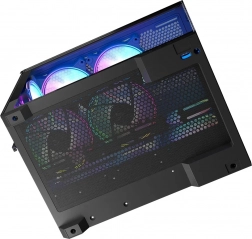Kabinettet leveres uden blæsere – vælg din egen airflow‑konfiguration. Øverste og nederste position understøtter 360 mm radiatorer, og den medfølgende ARGB‑controller håndterer op til 9 blæsere.