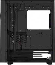 Kabinettet er klar til vandkøling med støtte til AIO op til 420 mm i fronten, 280 mm i toppen og 120 mm bagtil. Det indvendige rum rummer lange grafikkort og høje tårn-kølere, og der er gennemtænkt kabelstyring, gummigennemføringer og PSU-tunnel for et rent look.