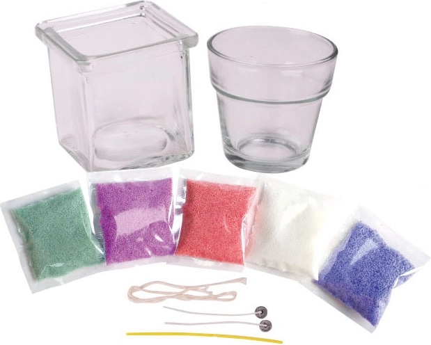 - 2 glasbeholdere til lys, 5 farvede vokse, væge, pind