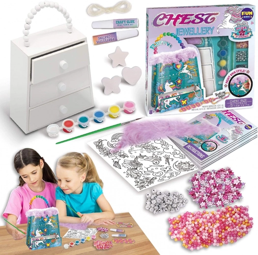 Lav dit unikke træ smykkeskrin i størrelsen 20x15x5,5 cm ved hjælp af dette sæt, der indeholder alt hvad du behøver. Kreativiteten kender ingen grænser, så du kan dekorere det efter din egen fantasi. Farverige perler og andre udsmykninger tilføjer dit mesterværk enestående karakter.