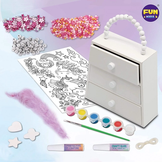 - Sættet indeholder et træ smykkeskrin, pensel, 6 farver, snor, lim og et bredt udvalg af dekorationer.