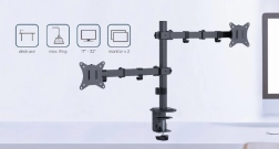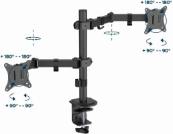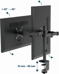 Denne dobbelte skærmholder er ideel til enhver arbejdsstation. Den gør det nemt at positionere skærme mellem 17" og 32", med en maksimal vægt på 9 kg pr. skærm. Holderens konstruktion sikrer, at dine skærme forbliver stabile og sikkert fastgjorte. Den er kompatibel med VESA-standarder (100 x 100 mm og 75 x 75 mm), hvilket garanterer bred kompatibilitet med forskellige skærme.