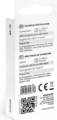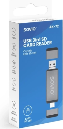 Savio 3-i-1 kortlæser er en ideel enhed for brugere, der har brug for fleksibilitet og hastighed i arbejdet med data. Ved hjælp af USB-C, USB-A og micro USB sikrer den alsidig tilslutning til en bred vifte af enheder, fra moderne bærbare til traditionelle stationære computere. Understøttelse af USB 2.0 muliggør hurtig dataoverførsel på op til 480 Mbps, hvilket giver bekvem brug.