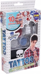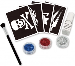 Læg blot skabelonen på, påfør tatoveringslim og drys den valgte glimmerfarve – når skabelonen fjernes, står et tydeligt og funklende motiv tilbage. De genanvendelige skabeloner giver masser af kombinationer og idéer.