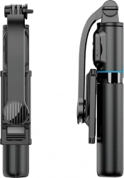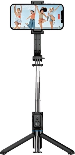 Selfie-stang med stativ X49 kombinerer æstetik og funktionalitet: den robuste konstruktion med stabil trefodsbase og et hoved med mulighed for præcis justering lodret og vandret sikrer skarpe optagelser uden rystelser. Den aftagelige Bluetooth-fjernbetjening gør det muligt at tage billeder og videoer på afstand – ideelt til solorejser og gruppefotos uden timer.