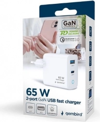 Universel 2-ports oplader med 65 W, der pålideligt forsyner dine mobiler, hovedtelefoner og ultrabooks med strøm. Den moderne GaN-teknologi sikrer høj effektivitet, mindre varmeudvikling og et kompakt format, så opladeren let passer i lommen eller rejsetasken.