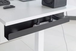 Denne robuste kabelbakke i stål er designet til ren og sikker kabelføring under arbejdsbordet. Skjuler opladere, forlængerledninger og strømskinner og frigør plads på bordpladen. Den pulverlakerede overflade i sort passer til moderne interiører og tåler daglig brug.