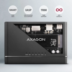 For stabil drift med SSD’er er der UASP for højere ydelse, TRIM for langtidsholdbar kondition og S.M.A.R.T. overvågning. Adapteren understøtter boot fra tilsluttede drev, Auto Spindown ved inaktivitet og Turn Off efter frakobling eller dvale på PC. USB‑strøm er tilstrækkelig til M.2 og 2.5" drev, og til 3.5" HDD medfølger en ekstern 12 V / 2 A adapter.