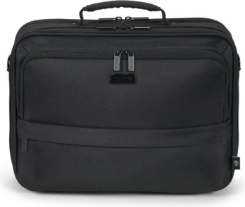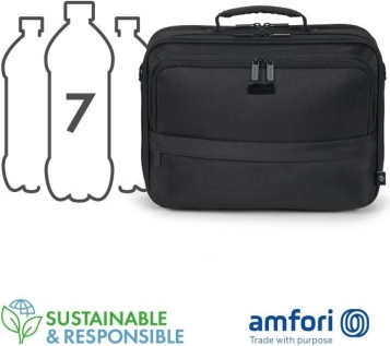 Elegant og miljøvenlig taske til bærbar computer i størrelsen 15–17,3" fra DICOTAs ECO-kollektion. Fremstillet af genanvendt PET, tilbyder polstret, låsbar rum, vandafvisende materiale og gennemtænkt organisering til tilbehør. Inkluderer RFID-lomme, skjult rum til GPS-tracker, trolley-strop og behagelig polstret skulderrem.