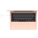 Den gyldne bærbare computer med moderne design viser, hvordan adapteren ser ud, når den er tilsluttet en stilfuld enhed, hvilket understreger dens æstetiske værdi.