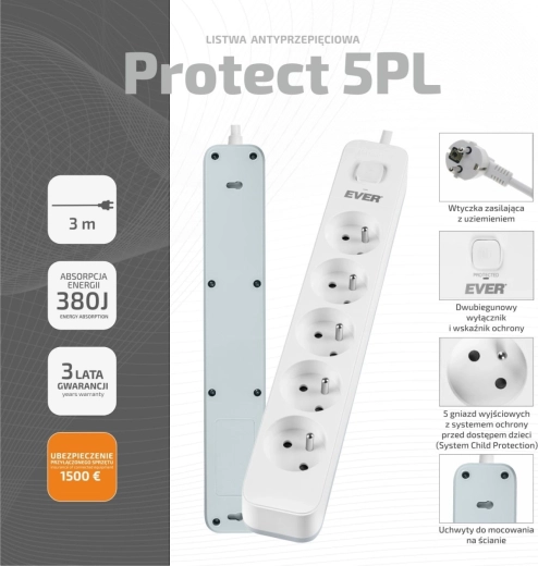 PROTECT 5PL er designet til sikker strømforsyning og effektiv overspændingsbeskyttelse af følsom elektronik. Takket være den høje kvalitet og det lange tilslutningskabel på 3 m når den nemt derhen, hvor du har brug for den.