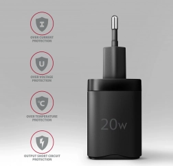 Universal USB‑C-oplader med 20 W effekt er ideel til moderne smartphones og tablets. Takket være protokollerne Power Delivery 3.0, Quick Charge 4+, PPS, AFC og FCP sikrer den maksimal mulig opladningshastighed på en bred vifte af enheder inklusive Apple iPhone 12–15, iPad, Samsung og Huawei.