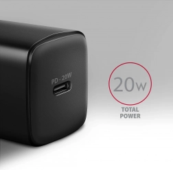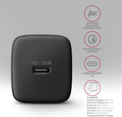 Kompakt vægoplader AXAGON 20W med én USB‑C-port oplader hurtigt telefoner og tablets takket være standarderne PD 3.0 / QC 4+. Understøtter udgang op til 20 W, er kompatibel med iPhone, Samsung, Huawei, Xiaomi m.fl., og tilbyder avancerede beskyttelser for sikker opladning.