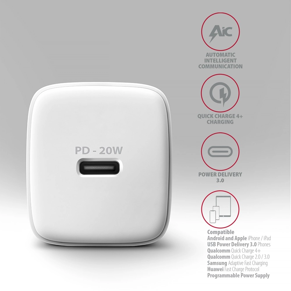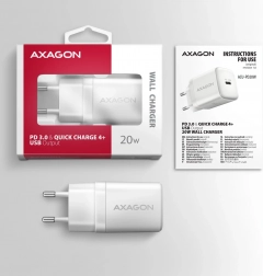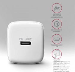Kompakt vægoplader AXAGON ACU-PD20W til hurtig opladning af mobile enheder. Med en samlet effekt på 20 W kan opladeren lade telefoner, tablets og andre mobile enheder med den højest mulige hastighed. Adapteren tilbyder en reversibel USB-C-stik.