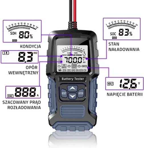 Enkel og intuitiv betjening med en stor og letlæselig LCD-skærm gør det nemt at kontrollere batteriers tilstand med kapacitet fra 3Ah til 250Ah. Enheden kræver ingen ekstra strømforsyning, og takket være den robuste konstruktion og kompakte mål er den ideel til både hjemme- og professionel brug.