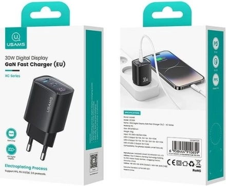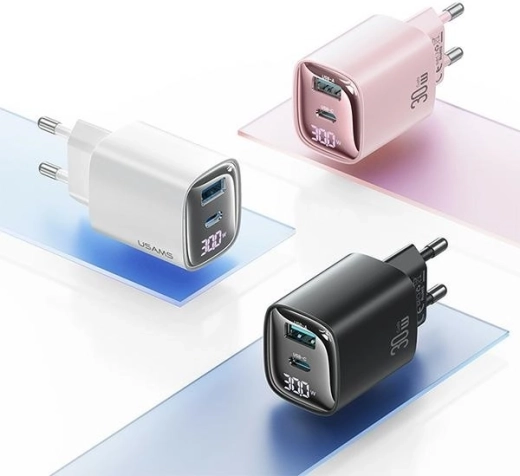 Kompakt 30W GaN‑oplader med LED‑display, USB‑C + USB, PD‑hurtigopladning og flertrins beskyttelse. Hurtig og sikker opladning af to enheder samtidig.