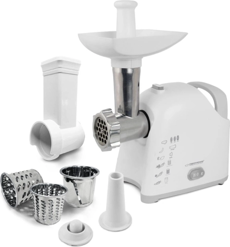 Den alsidige kødhakker med rivejern ESPERANZA Wellington kombinerer høj ydeevne og praktisk anvendelighed til ethvert køkken. Takket være en motor på op til 2200 W maler du nemt kød og andre råvarer, og med tre kværnskiver opnår du den ønskede grovhed. Udskiftelige tilbehør muliggør produktion af pølser og kebab/kebbe, mens tre tromler hurtigt bearbejder frugt, grøntsager, ost, chokolade eller nødder. Kraftig snekkedrev i metal, kniv i rustfrit stål og skridsikre fødder sikrer lang levetid og sikker drift.