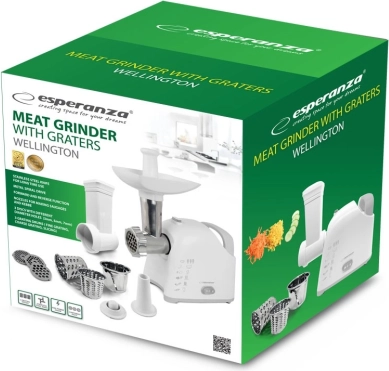ESPERANZA Wellington er en moderne og funktionel hjælper, der kombinerer kødhakker og rivejern i én enhed. I kværnetilstand klarer den ikke kun kød, men også andre fødevarer, inklusive blandinger til frikadeller eller pâté. Rivefunktionen gør det nemt at skære og knuse frugt, grøntsager, hård ost, chokolade eller nødder – ideelt til hurtig tilberedning af salater, desserter og drys.