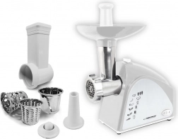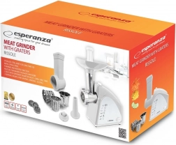 Esperanza RISSOLE kombinerer en kraftfuld kødhakker med et praktisk rivejern til madlavning i hverdagen. Takket være den metalbaserede snekkedrev og det rustfri stålblad bearbejdes ingredienser hurtigt og grundigt. Tre huldisker (3, 5 og 7 mm) gør det muligt præcist at vælge formalingsgrad efter opskriften.