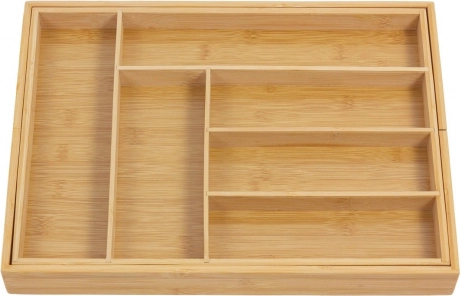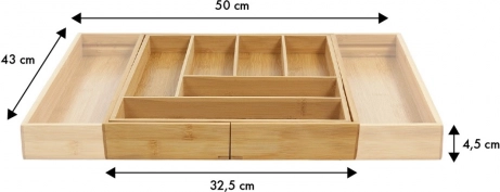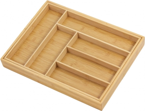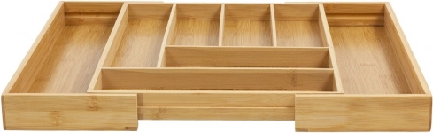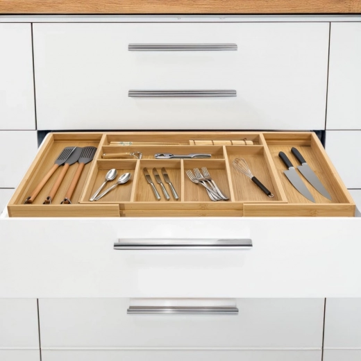Hold orden i køkkenet med en alsidig bambusindsats, der tilpasser sig din skuffe. De udvidelige sidepaneler skaber ekstra plads, og sammen med de faste skillevægge holder de alting pænt organiseret. Det naturlige look i massivt bambus passer både til moderne og klassiske interiører.