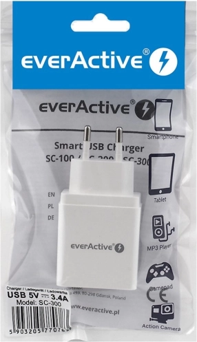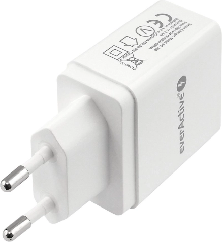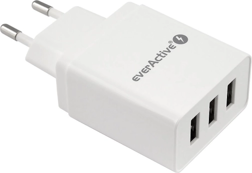 Kompakt vægoplader fra everActive med 3× USB og iQ Smart Charging oplader op til tre enheder samtidigt. Den tilbyder hurtig og sikker opladning af smartphones, tablets og andre gadgets, har beskyttelse mod overspænding, kortslutning og overophedning, og takket være energieffektivitet klasse VI er tab og standby-forbrug minimalt.