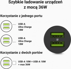 Nyd hurtig og sikker opladning på farten. Bilopladeren GREENCELL PowerRide Nano tilbyder samlet effekt på 36 W, to USB-A-udtag og moderne Ultra Charge for markant hurtigere opladning end standardopladere. Takket være de kompakte mål passer den diskret ind i interiøret i enhver bil.