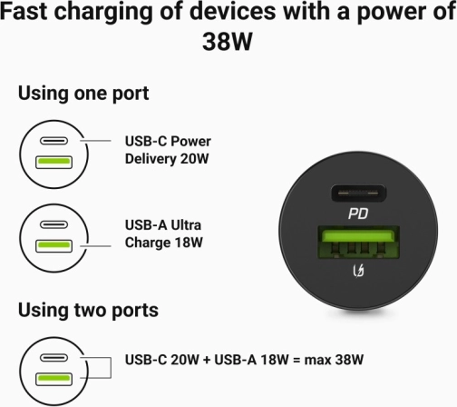 Oplev ydelse og kompakte mål i ét. Bilopladeren GREEN CELL PowerRide Nano38 med en samlet effekt på 38 W kombinerer USB‑C PD 20 W til moderne telefoner og tablets og USB‑A 18 W Ultra Charge til hurtig opladning af dit udstyr. Det minimalistiske design med aluminiumskonstruktion passer perfekt til interiøret i enhver bil.