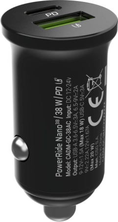 Den kompakte biloplader GREEN CELL PowerRide Nano38 tilbyder hurtig opladning på 38 W via USB‑C Power Delivery 3.0 og USB‑A Ultra Charge. De to porte klarer samtidig opladning af telefon, navigation eller kamera. Et elegant aluminiumshus, en komplet pakke af beskyttelser og kompatibilitet med 12 V og 24 V stikkontakter gør den til den ideelle rejsemakker.